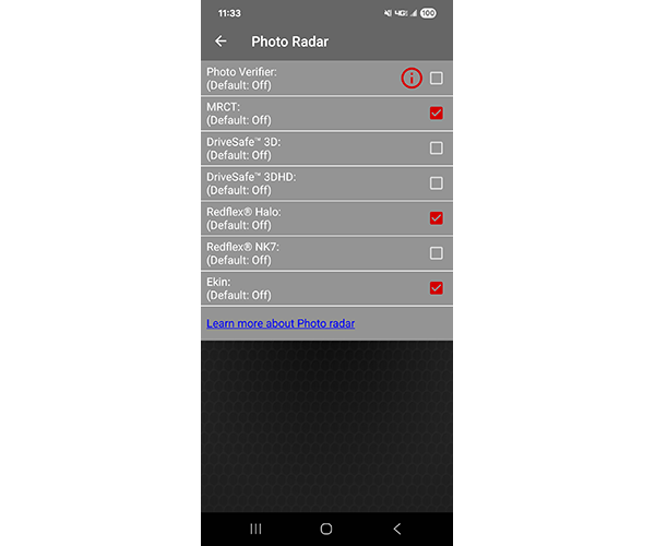” in the bogey counter indicates photo enforcement. When using our app, the frequency and type of photo radar will be shown. This method of enforcement is more complex than ordinary radar, therefore V1 Gen2™ has more settings available to adapt to local conditions.